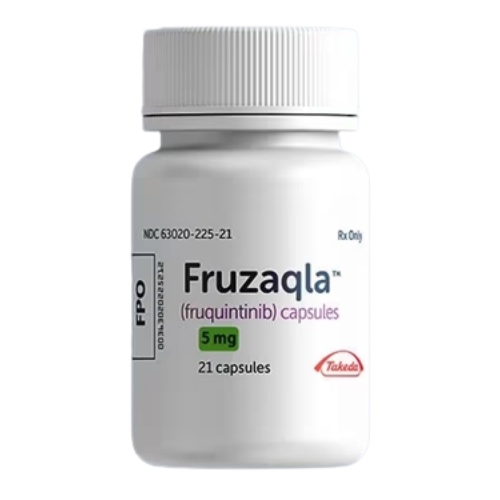 呋喹替尼以 Fruzaqla® 为商品名(1 mg 和 5 mg 硬胶囊,武田制药),是一种高度选择性的 VEGFR-1、VEGFR-2 和 VEGFR-3 酪氨酸激酶抑制剂。其在实体瘤中的抗肿瘤作用,主要源于对肿瘤血管生成的抑制,使肿瘤因血供受限而生长减缓,转移能力下降。